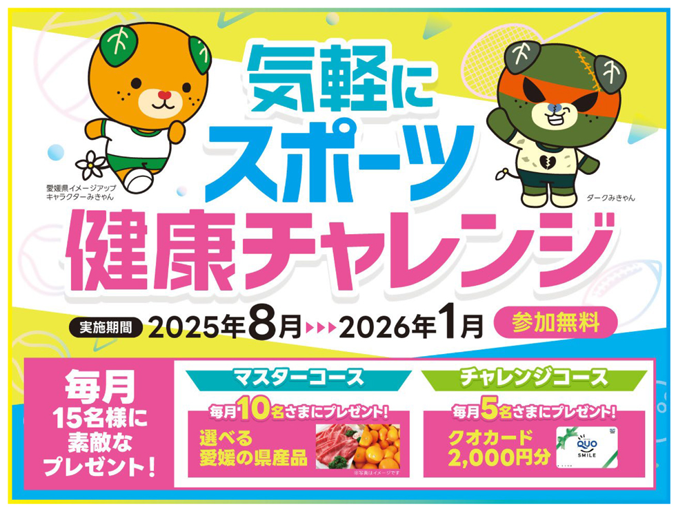 1ヶ月で指定した条件を4回達成した愛媛県在住の方を対象に、毎月抽選で愛媛の県産品が選べるデジタルカタログ(毎月10名様)やQUOカード(毎月5名様)など素敵な賞品をプレゼント中です。スマホやスマートバンド(スマートウォッチ)にスポーツ記録やウォーキング記録をとって応募してください。(ご応募は1人1回まで。毎月応募可能です。)